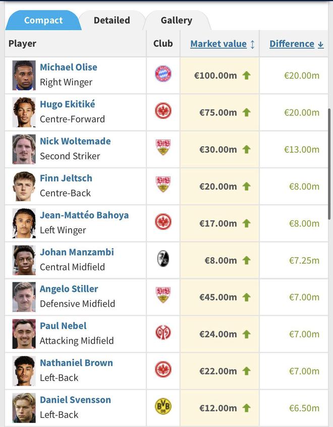 德轉(zhuǎn)德甲身價(jià)漲幅榜:奧利塞、埃基蒂克漲幅2000萬(wàn)領(lǐng)跑